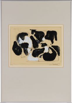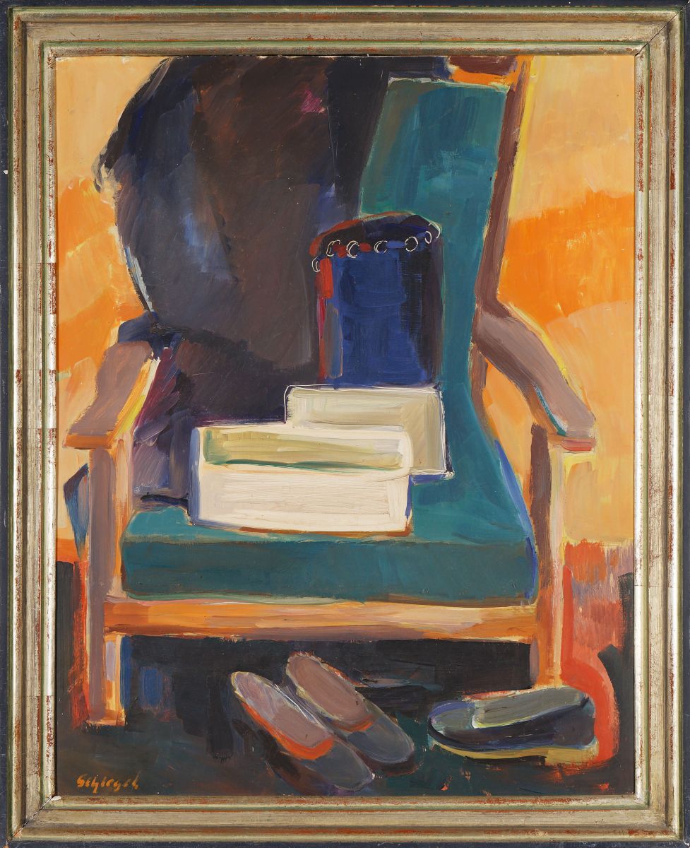 Ein klares Sujet – die Stofflichkeit der Gegenstände ist Anliegen dieses Werks. Sie wird erreicht durch eine intensive Farbgebung. Bildfüllend steht ein Sessel vor einem farblich bewegten Hintergrund. Sessel, Schachtel und Schuhe verleihen dem vordergründig belanglosen Stillleben ein prägendes Gewicht.