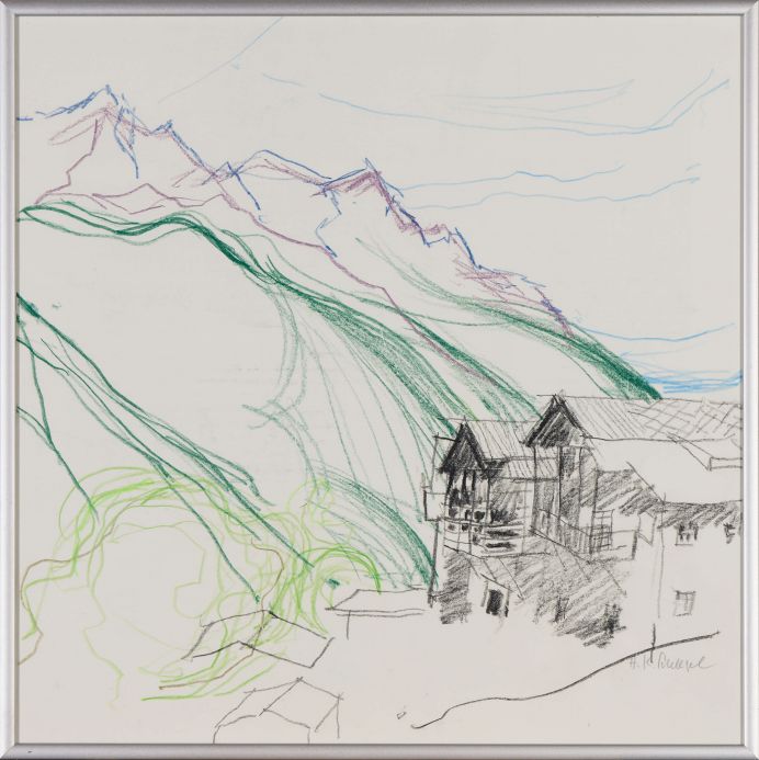 Zusammenspiel von Landschaft und Kultur – einem durch kraftvolle Linienführung gestaltetem Bergmassiv steht rechts im Vordergrund eine ruhige, aber doch gewichtig erscheinende Häusergruppe zur Seite. „Die Spitzen der Giebeldächer korrespondieren mit den Spitzen der Berge.”