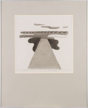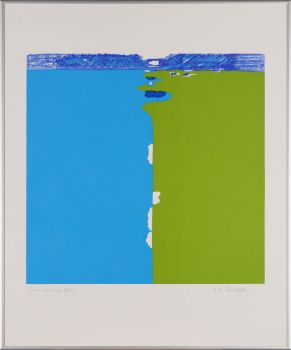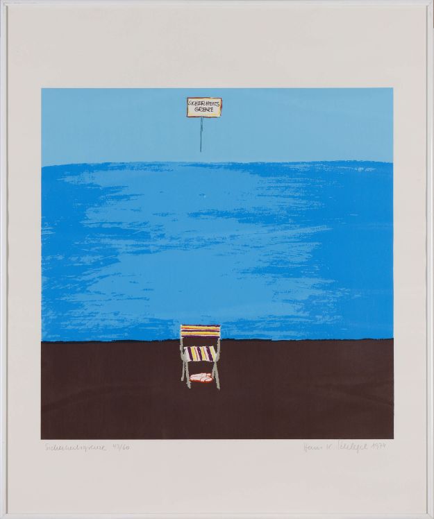 Küste bei Bibione (I) – einem Cartoon nicht unähnlich wird der Blick über den Strand aufs Meer gerichtet. Einzig ein verlassener Stuhl, unter dem ein paar Badeschuhe stehen, und ein weiter draußen im Meer aufragendes Warnschild lassen Leben erahnen.