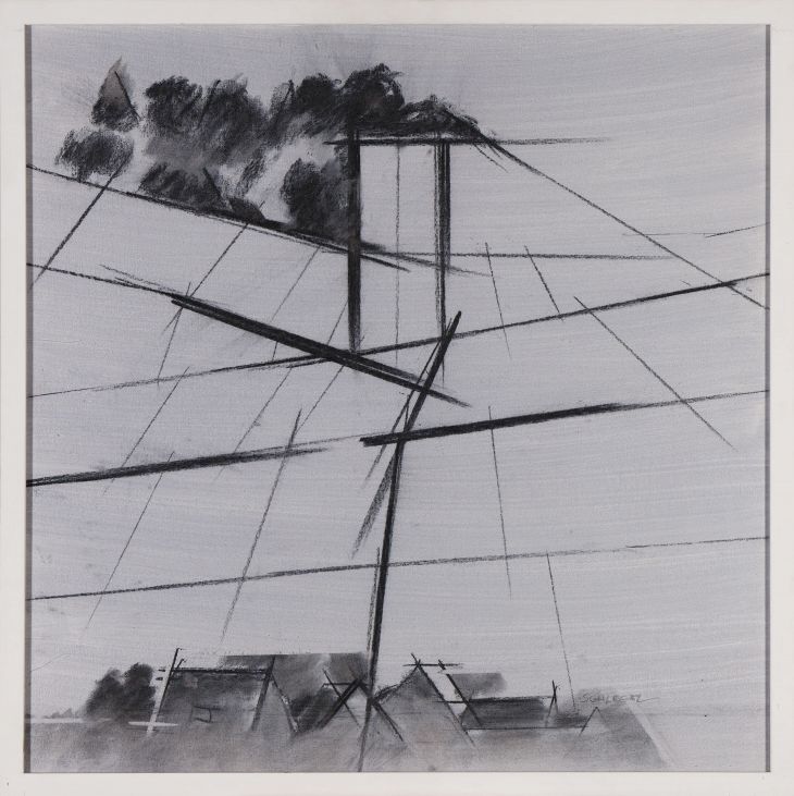 Studie einer Weinberglandschaft – der Blick ist über Uhlbach in Richtung auf den Götzenberg gerichtet. Die Wegführungen und Wassertreppen in der Landschaft gliedern das Terrain mit klaren Linien. Eine Kompositionsstudie, die in dem Bild „Götzenberg – Impuls II” farblich ausgebaut wurde.