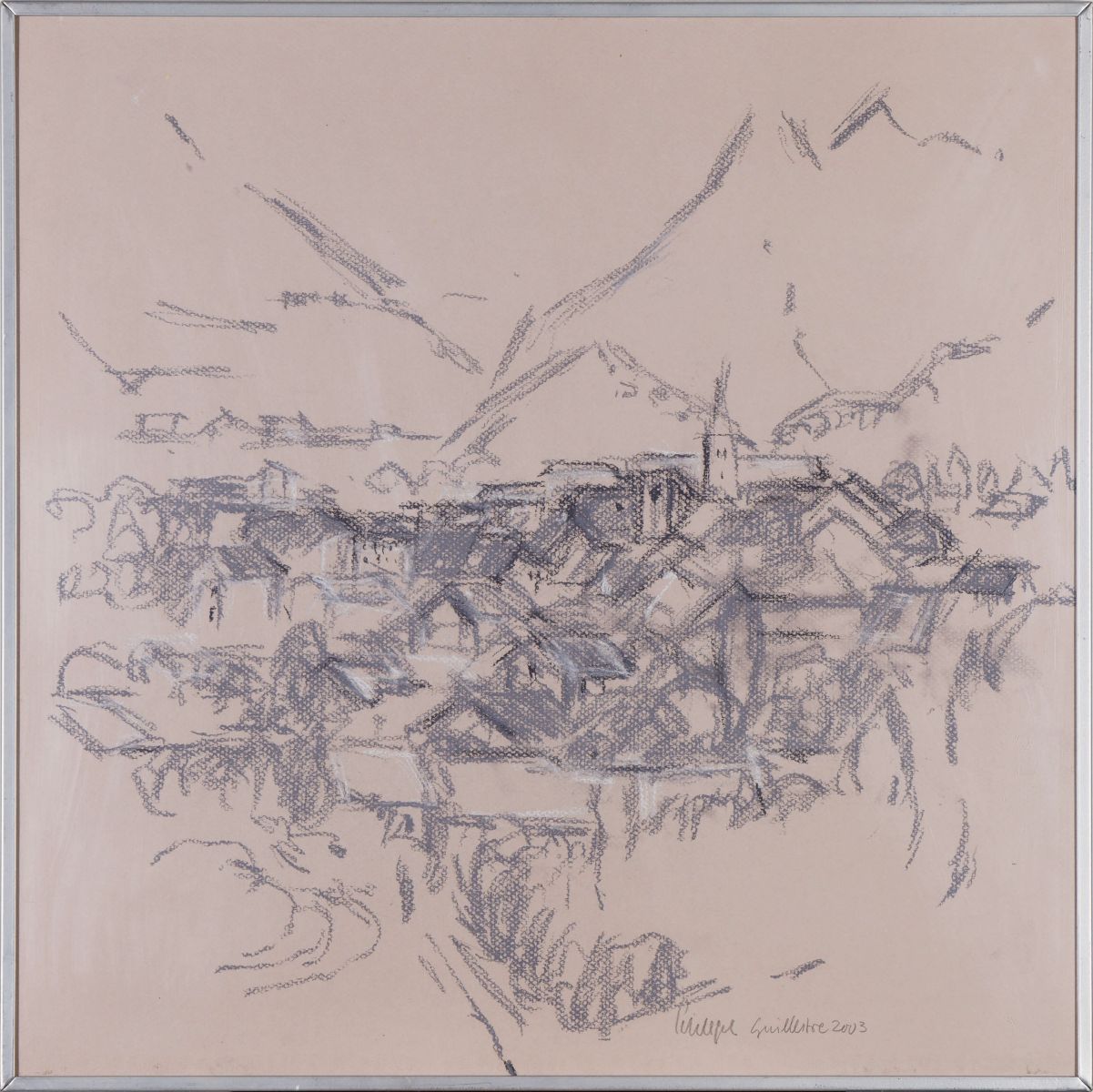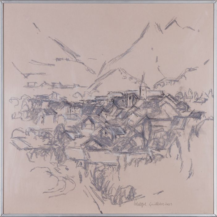Blick auf Guillestre (F) – einer Weitläufigkeit der flächigen Berglandschaft steht in der Bildmitte eine verdichtete Linienführung gegenüber, die bedingt ist durch die relativ detailgetreue Wiedergabe der Bebauung im Tal. Die graphische Gestaltung ist so gewählt, dass sie einer naturgetreuen Darstellung nahekommt.