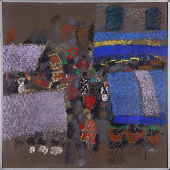 Durchlässigkeit und Dominanz – Präsentation eines Markttages in Guillestre (F). Farblich kontrastieren die links in neutraler und rechts in überwiegend kräftiger blauer Farbe gehaltenen Dächer der Marktstände gegen die in einer horizontalen und vertikalen Achse gezeigten Marktbesucher. Die großflächigen Dächer der Marktstände verstärken die Wirkung der Marktbesucher, die punkthaft strukturiert wurden.
