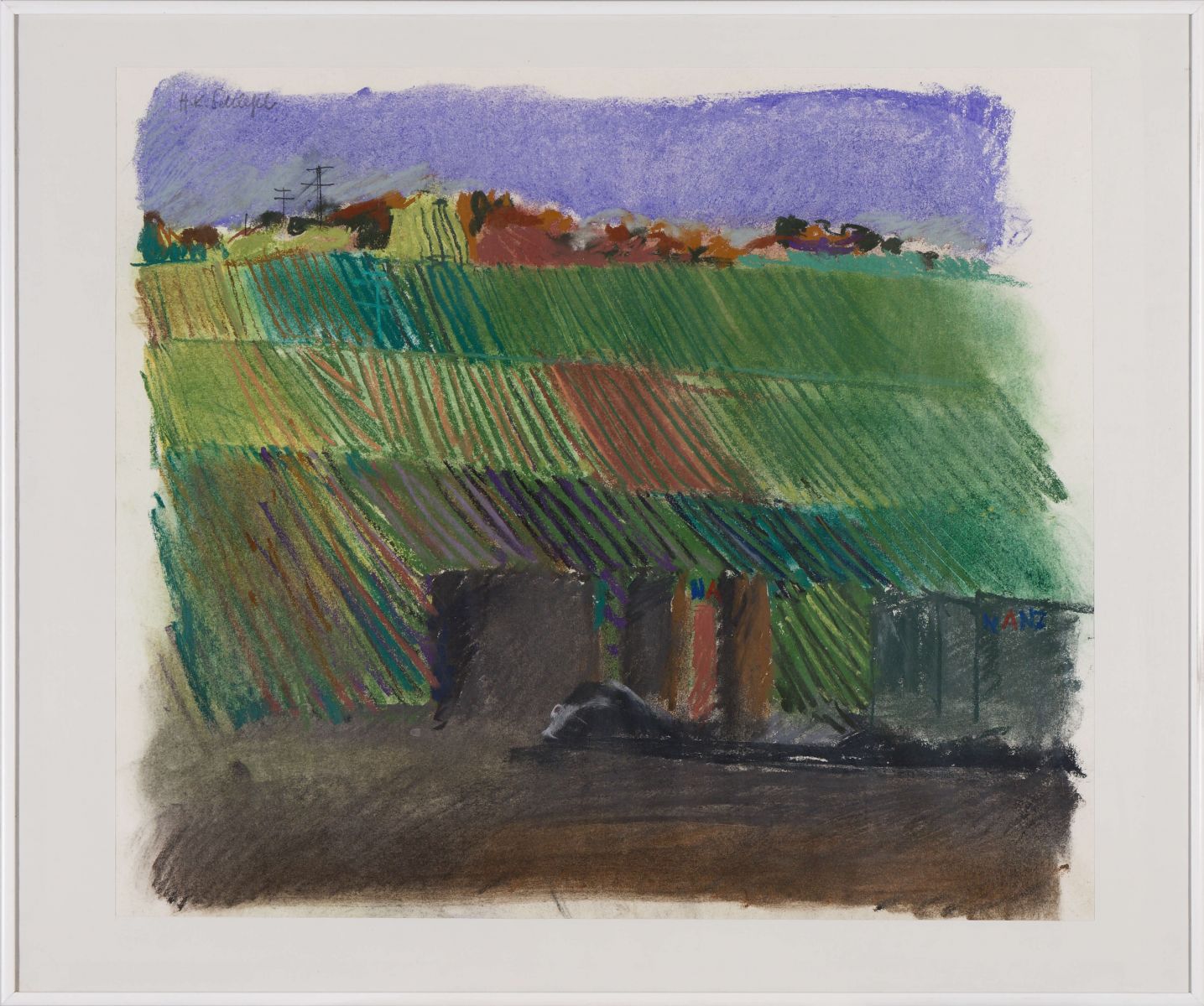 Landwirtschaftliche Nutzung – die für den Weinbau günstige Hanglage zwischen Ober‐ und Untertürkheim erfuhr bei der Rebflurbereinigung eine Neugliederung, wodurch die Bewirtschaftung der Flächen vereinfacht wurde. Während die Talsohle mit Fabrikbauten zugestellt ist und im Dunkeln liegt, zeigt sich die Hanglage sonnenbeschienen und im Wesentlichen durch Wegeführungen horizontal gegliedert. Die senkrecht verlaufenden Linien symbolisieren die Reihen der Weinreben.