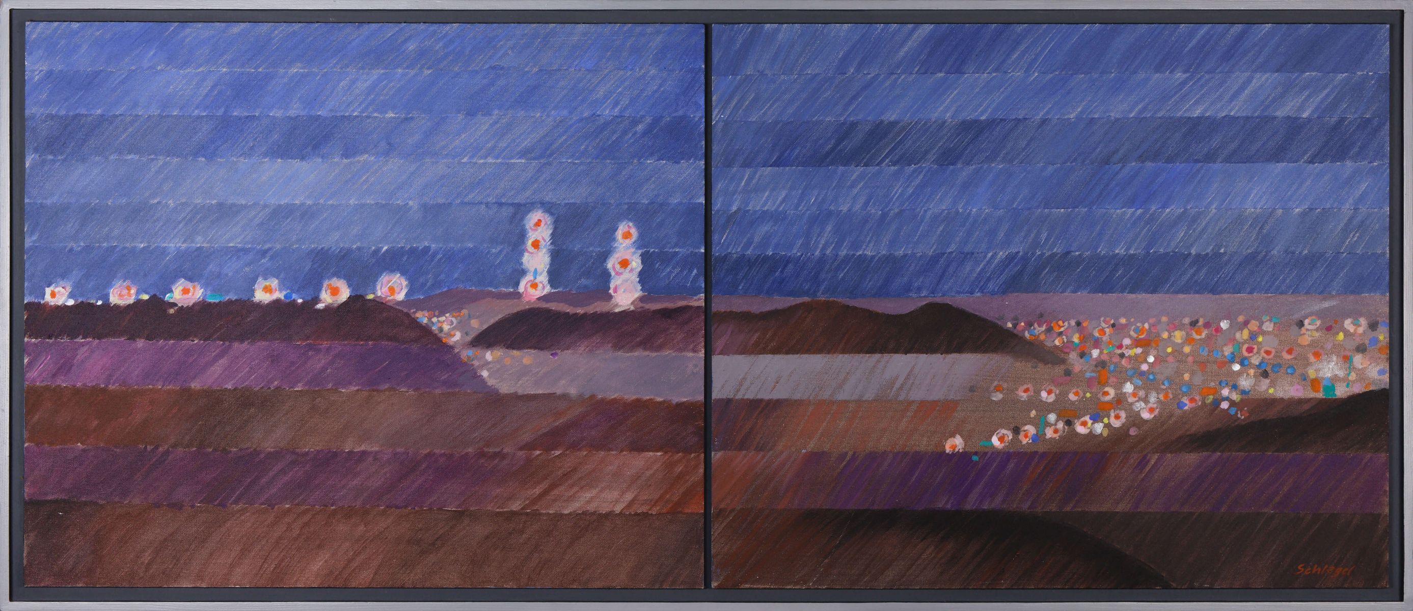Abend über dem mittleren Neckartal – in ruhigen Brauntönen breiten sich die Flächen der Ausläufer des Schurwaldes und der Fildern aus. Ansatzweise erkennt man nach rechts hin aufgrund der geographischen Lage Untertürkheim und Bad Cannstatt. Mittig im Bild erstrahlen der Stuttgarter Fernsehturm und der Fernmeldeturm vor dem Firmament. Nach links, wie auf einer Perlenschnur aufgereiht, leuchten Signallichter, die zum Flughafen gehören.