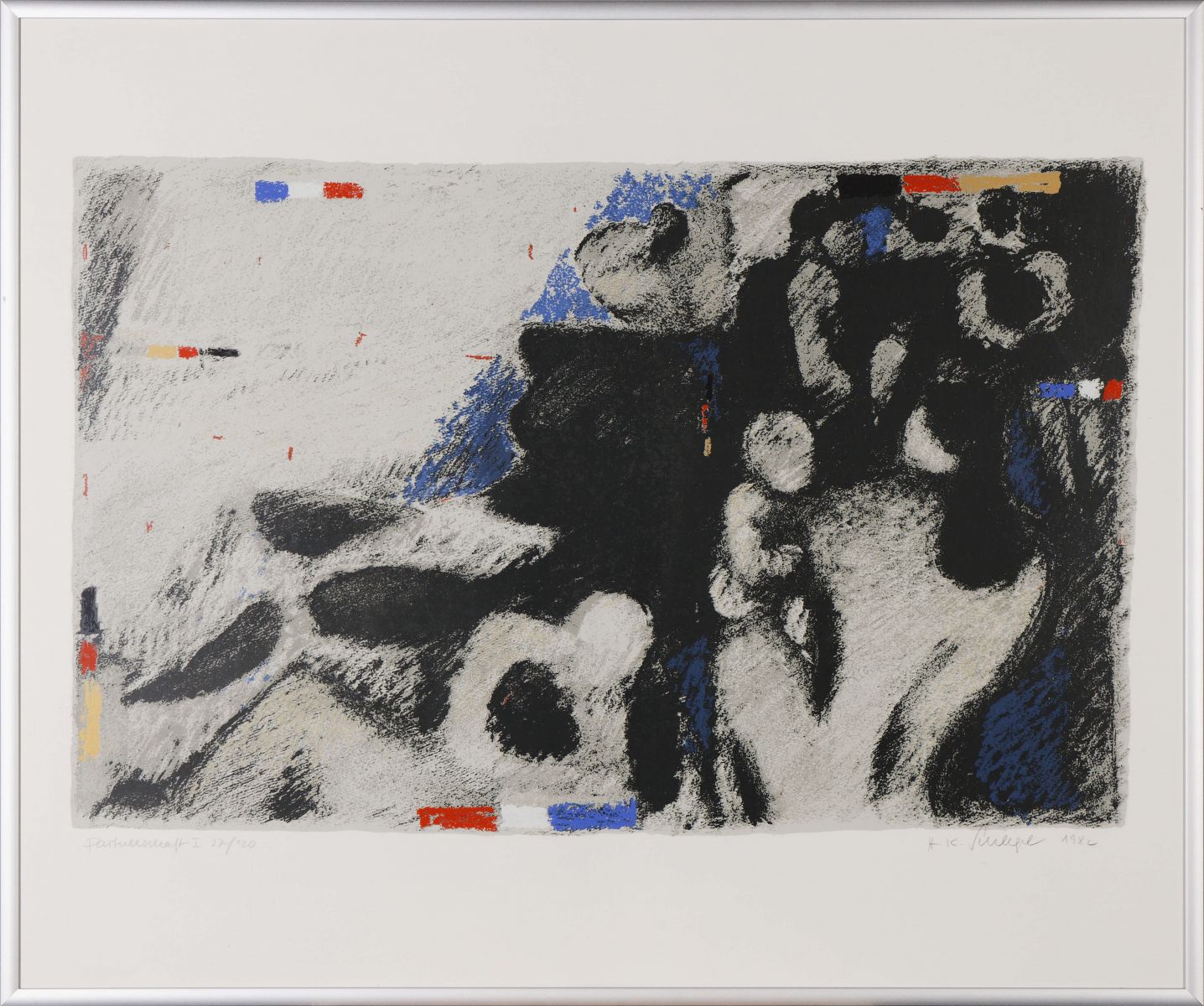 Strandleben – gelöste Stimmung vermittelt dieses überwiegend vom Hell‐Dunkel‐Kontrast bestimmte Bild. Entspannung, wie sie im Urlaub erlebt werden darf, vermitteln die Silhouetten der sitzenden und liegenden Figuren. Erkennbare Entspannung aber auch, was die Beziehung zwischen Frankreich und Deutschland angeht, wie die kleinen Farbstreifen in den Staatsfarben andeuten.