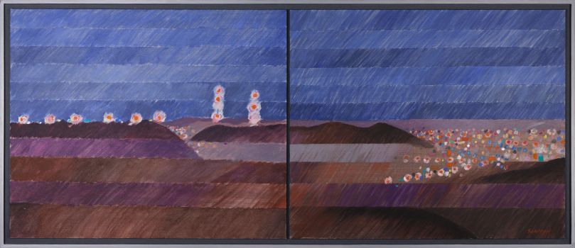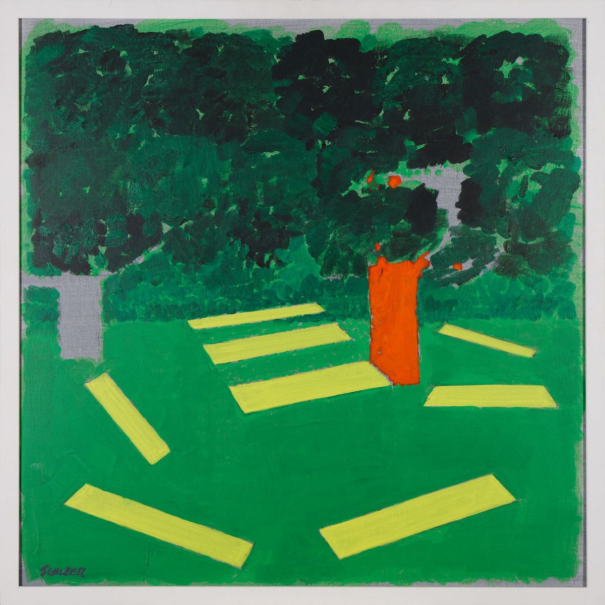 Naturformen in Form von dicht bewachsenen Bäumen werden von geometrischen Formen (Tische) bestimmt, die deutliche Akzente setzen.